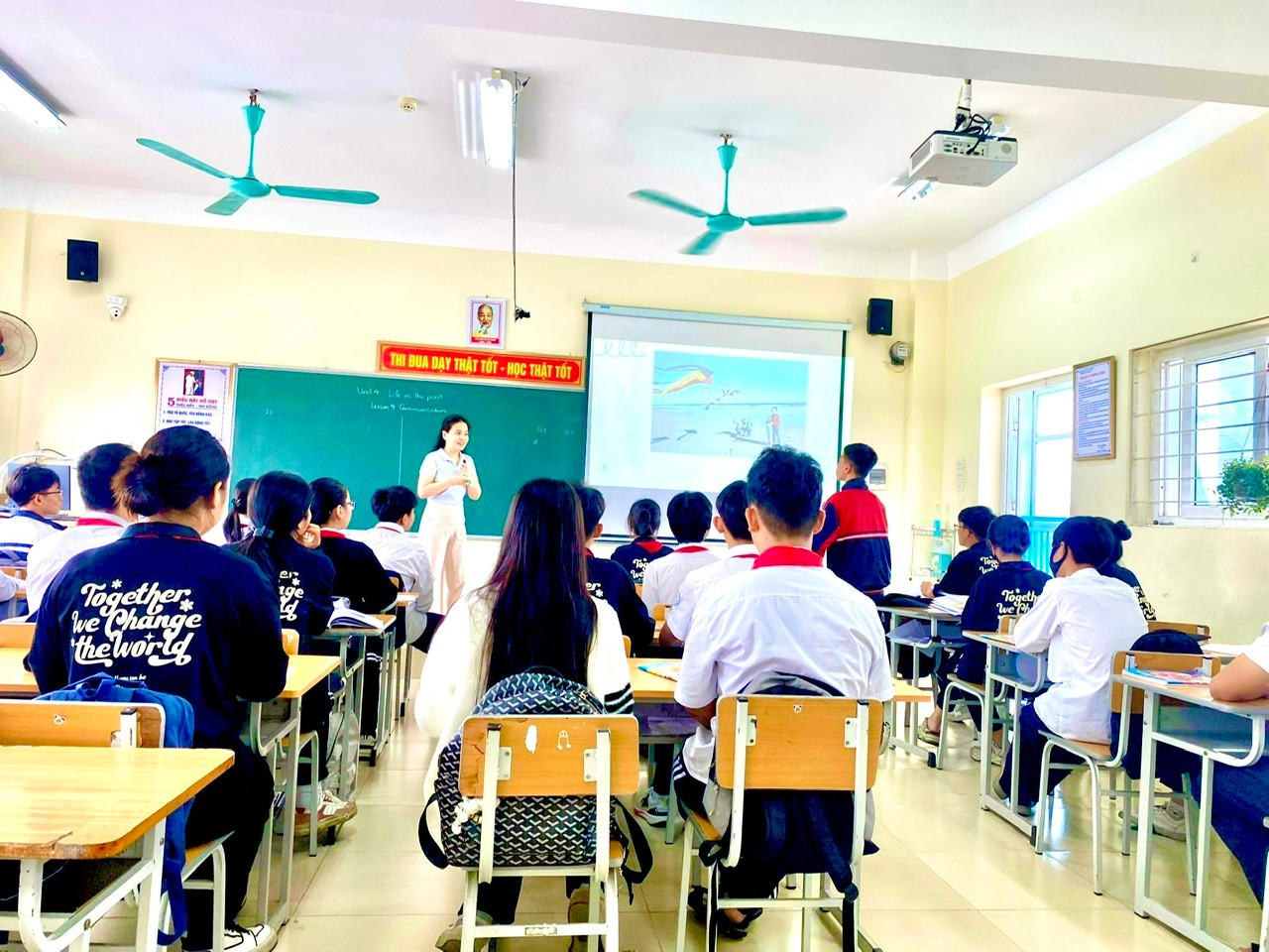 Giờ học đã được diễn ra trực tiếp tại phòng học của lớp 9A5. Cô Nguyễn Lan Hương đã sử dụng các hình ảnh PowerPoint đầy màu sắc để dạy từ vựng khiến học sinh vô cùng hứng thú và sôi nổi tham gia xây dựng bài.