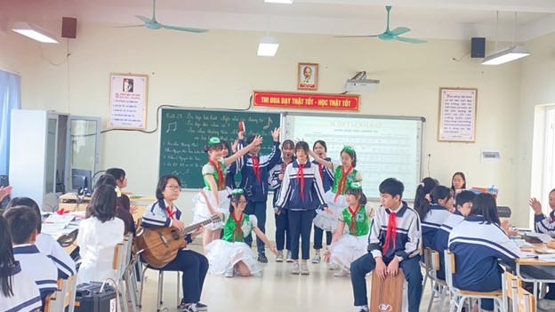 Bên cạnh đó, trong tiết học, cô giáo Vũ Thị Huyền Trang đã khơi gợi cho học sinh sự chủ động, sáng tạo để tiếp cận các kiến thức của bài học và đặc biệt tiết học chính là nơi để các học sinh được thể hiện tài năng, năng khiếu âm nhạc của mình. Đến dự tiết dạy – học của cô và trò, các thầy cô giáo trong BGK cuộc thi và các thầy cô giáo trong hội đồng sư phạm nhà trường đều thấy rõ sự hào hứng, sáng tạo của giáo viên và học sinh.