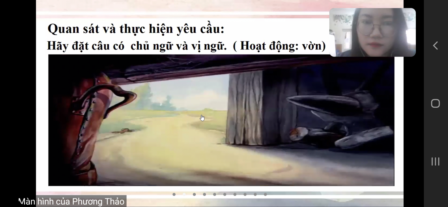Bắt đầu bài học bằng một đoạn phim hoạt hình ngắn Tom and Jerry, cô Thảo yêu cầu học sinh quan sát hành động của con vật, đặt câu để diễn đạt hoạt động của các nhân vật đó. Học sinh vừa được chơi (xem phim) vừa được học. Vì thế, lớp học sôi nổi ngay từ hoạt động mở đầu. Từ sản phẩm của các con cô giáo dẫn vào bài học mới nhẹ nhàng, cuốn hút.