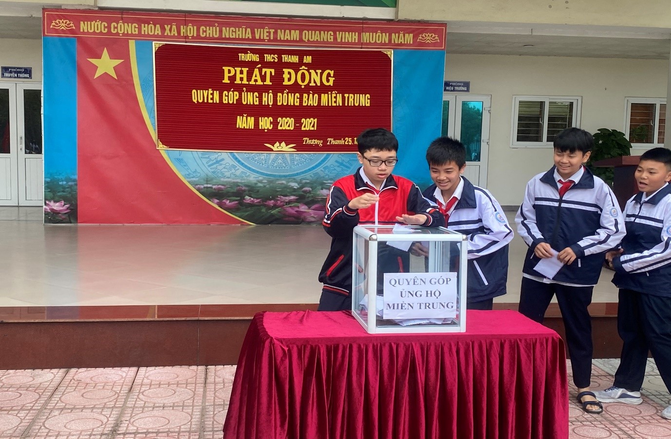 Các CBGVNV và 100% học sinh trường THCS Thanh Am đều nhiệt tình tham gia ủng hộ. Các em học sinh- với tấm lòng thơm thảo của mình đã biết cùng nhau giúp đỡ những bạn nhỏ miền Trung, mong các bạn và gia đình sớm vượt qua khó khăn, ổn định cuộc sống.